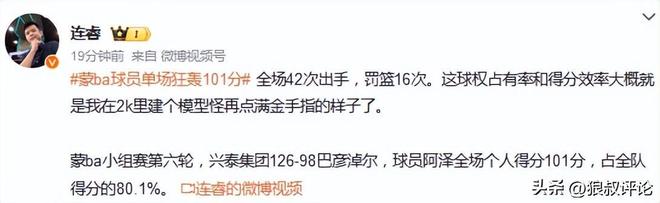 博主羅掌柜體育發(fā)文點(diǎn)評(píng):超越張伯倫!蒙BA球員單場狂轟101分,兩分28投27中,三分14中11。