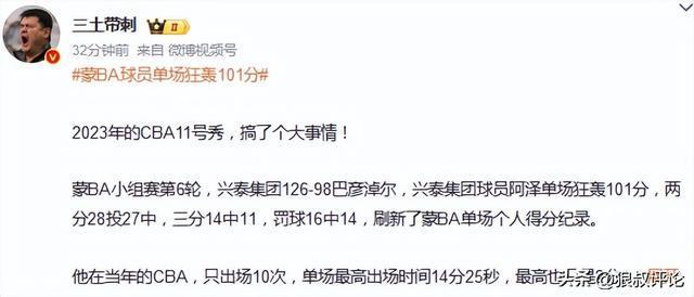 北京時(shí)間10月21日,BA小組賽第6輪,興泰集團(tuán)126-98巴彥淖爾,前CBA球員阿澤單場狂轟101分,兩分28投27中,三分14中11,刷新了蒙BA單場個(gè)人得分紀(jì)錄。