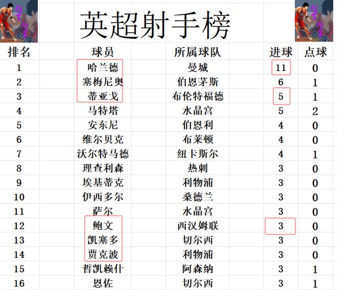 射手榜方面,哈蘭德11球領(lǐng)跑,在和姆巴佩的隔空較量中,哈蘭德還是稍占上風。塞梅尼奧6球排在第2,蒂亞戈今天錯失很多機會只打入1球,追上馬特塔,5球并列第3。鮑文今天無力進球,還是和?;倏耍Z克波,恩佐,哲凱賴什等人3球剛好擠入前十。