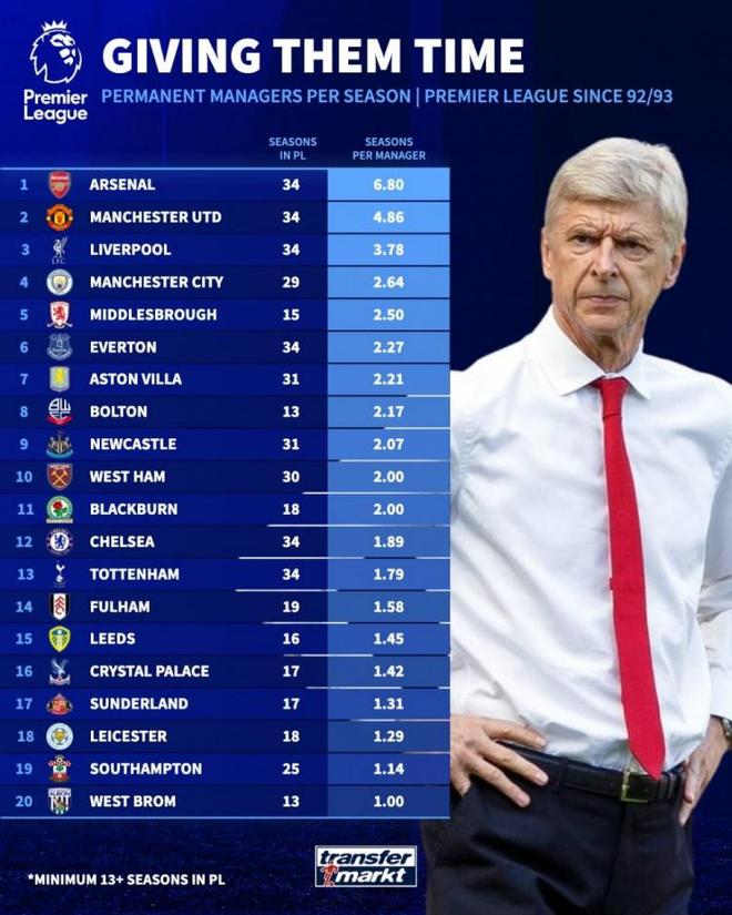 《轉(zhuǎn)會(huì)市場》統(tǒng)計(jì)了英超各隊(duì)的歷任正式主教練平均執(zhí)教年限情況,阿森納無懸念居首的。