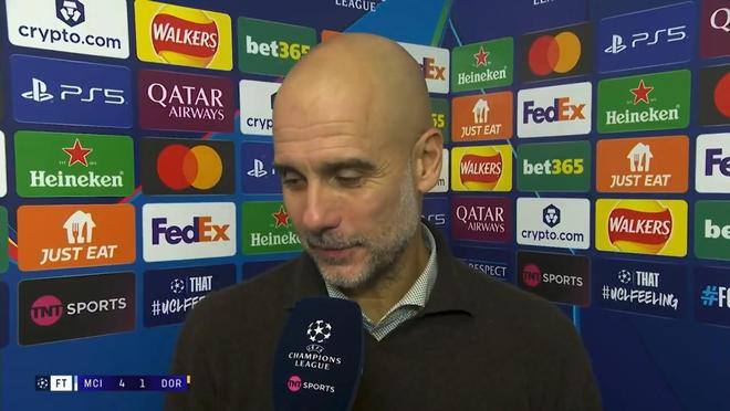 率隊在歐冠聯(lián)賽階段第4輪主場4-1大勝多特蒙德之后,曼城主教練瓜迪奧拉接受了來自TNT體育的采訪。